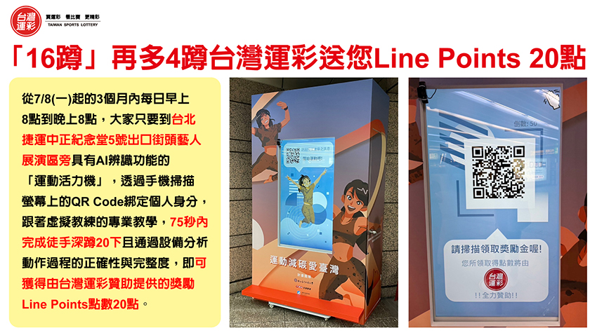 | 7/8(一)起的3個月內每日早上8點到晚上8點,大家只要到台北捷運中正紀念堂5號出口街頭藝人展演區旁具有AI辨識功能的「運動活力機」,透過手機掃描螢幕上的QR Code綁定個人身分,跟著虛擬教練的專業教學,75秒內完成徒手深蹲20下且通過設備分析動過程的正確性與完整度,即可獲得由台灣運彩免費提供的20點Line Points獎勵。 |