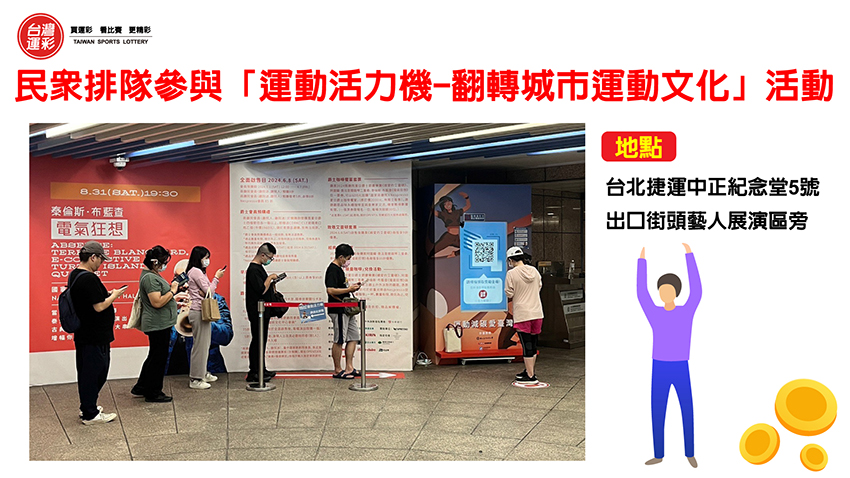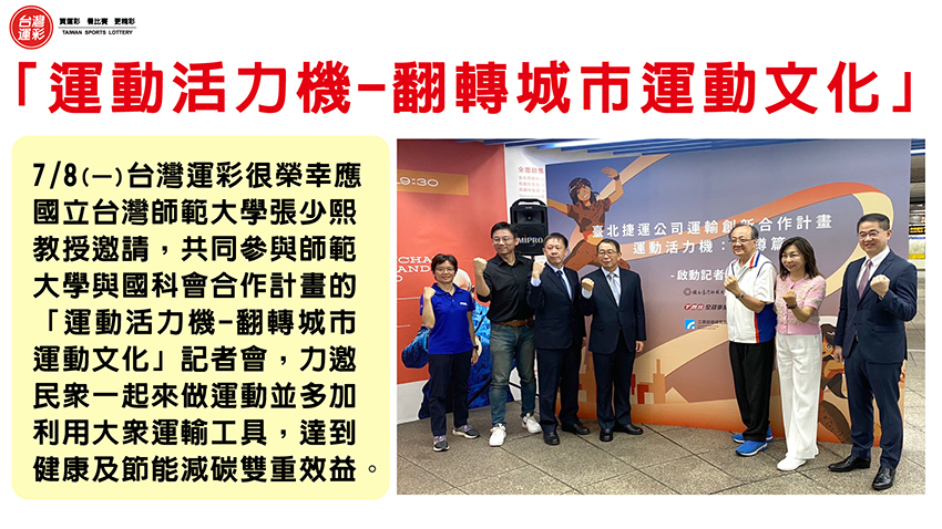 時下「16蹲」正夯!知名男團Energy一首輕快動感的「星期五晚上」颳起時下年輕人一股「16蹲」的風潮,現在只要在台北捷運中正紀念堂5號出口街頭藝人展演區旁的「運動活力機」前再多4蹲,就可以得到台灣運彩免費提供的20點Line Points,歡迎大家在活動截止前踴躍前往體驗。 7/8(一)台灣運彩很榮幸應國立台灣師範大學張少熙教授的邀請,共同參與師範大學與國科會合作計畫的「運動活力機-翻轉城市運動文化」記者會,力邀民眾一起來做運動並多加利用大眾運輸工具,達到健康及節能減碳的雙重效益。 |
