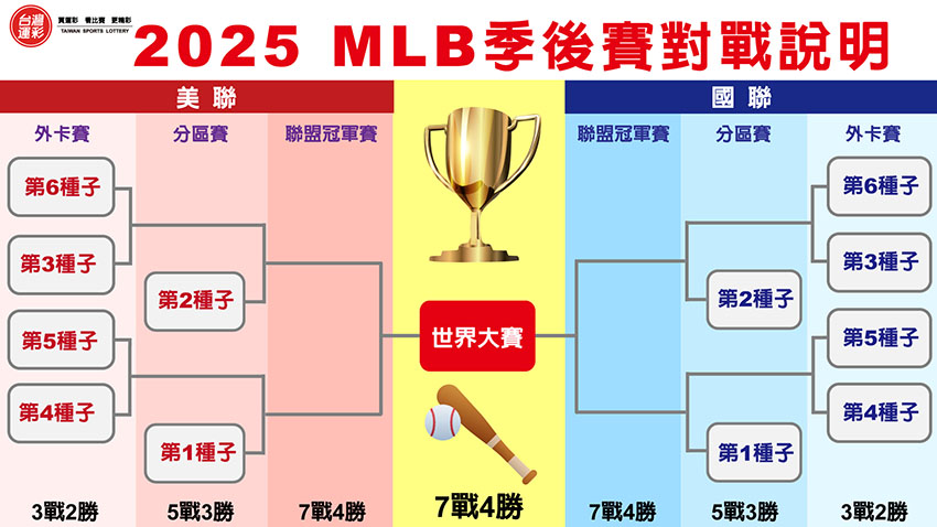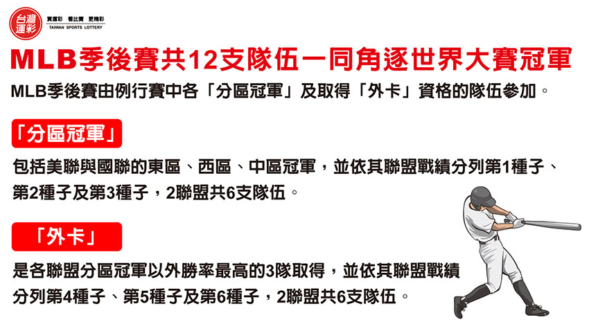 | MLB季後賽的隊伍為12隊,由各「分區冠軍」及取得「外卡」資格的隊伍參加,其中「分區冠軍」包括美聯與國聯的東區、西區、中區冠軍,並依其聯盟戰績分列第1種子、第2種子及第3種子,2聯盟共6支隊伍;「外卡」則是各聯盟分區冠軍以外勝率最高的3個隊伍取得,並依其聯盟戰績分列第4種子、第5種子及第6種子,2聯盟的外卡共6支隊伍,合計12支隊伍一同角逐世界大賽冠軍。各聯盟內的第1種子與第2種子首輪輪空,由第4種子與第5種子以及第3種子與第6種子先分別進行3戰2勝的系列戰,獲勝的2支隊伍再分別與第1種子與第2種子進行5戰3勝的系列戰,獲勝隊伍晉級7戰4勝的聯盟冠軍戰,取得聯盟冠軍隊伍再晉級7戰4勝的世界大賽。 |