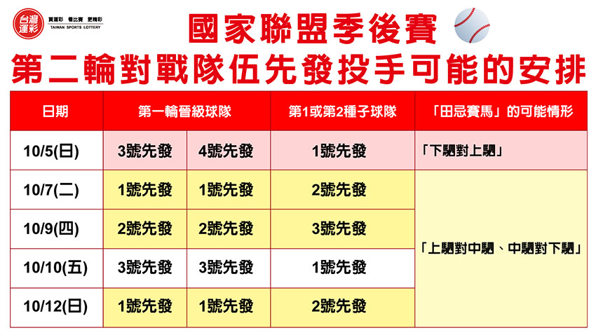 | 今年季後賽首輪賽事從10/1(三)至10/3(五)連續3天,次輪賽事從10/5(日)開始,首輪出賽的隊伍幾乎都會安排前3大先發投手應戰,力拚晉級下一輪,無論第一輪獲勝隊伍是2勝0敗晉級或2勝1敗晉級,由於一般MLB先發投手都有投1休4的慣例,晉級第二輪的球隊10/5(日)進行第1場比賽時其1號先發投手上場的機會不高,因為僅休息3天,即可能由第3號先發投手(若以2勝0敗晉級)或第4號先發投手(若以2勝1敗晉級)出賽;反之,第一輪輪空的各聯盟第1或第2種子球隊以逸待勞,在第二輪第1場比賽時一般都是會派出第1號先發投手迎戰,在投手戰力上勢必處於優勢,第2場以後就要特別注意雙方投手的戰力會不會出現「下駟對上駟、上駟對中駟、中駟對下駟」之「田忌賽馬」的情形,這些都攸關著比賽及投注的結果,提供大家參考。 |