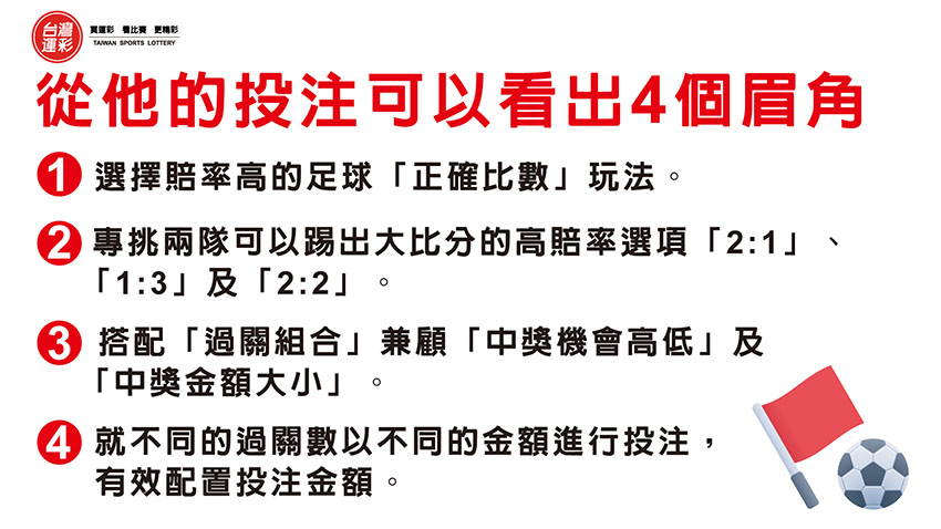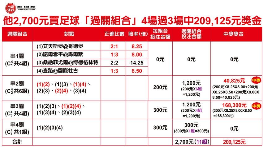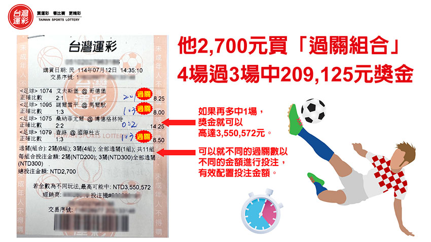 他買足球「過關組合」4場過3場中209,125元獎金(20251028中時電子報)