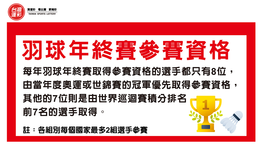 世界羽聯總獎金年度最高的賽事「世界巡迴賽總決賽」(簡稱羽球年終賽)12/17(三)至12/21(日)在中國杭州舉行,只有年度表現最佳的8名選手取得參賽資格,比賽一開始就是強強對決精彩可期,台灣運彩場場開盤提供投注,希望大家會喜歡。 |