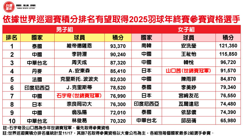 2025羽球年終賽強強對決 運彩場場開盤(20251216中時電子報)