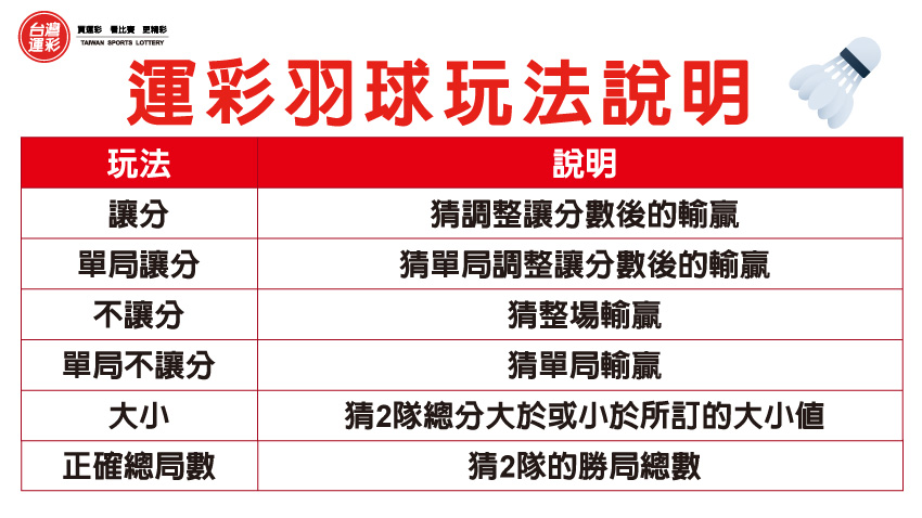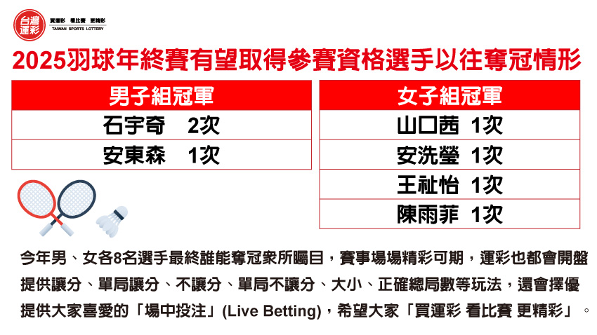 | 本屆有望取得參賽資格選手中曾經奪得冠軍的男子組有石宇奇的2次以及A.安東森的1次,女子組的有山口茜、安洗瑩、王祉怡以及陳雨菲的各1次,今年男、女各8名選手最終誰能奪冠眾所矚目,賽事場場精彩可期,運彩也都會開盤提供讓分、單局讓分、不讓分、單局不讓分、大小、正確總局數等玩法,還會擇優提供大家喜愛的「場中投注」(Live Betting),希望大家「買運彩 看比賽 更精彩」。 |
