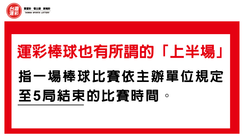 | 運彩棒球也有所謂的「上半場」,指的是「一場棒球比賽依主辦單位規定至5局結束的比賽時間」。運彩棒球的玩法依據「法定比賽時間」的不同可以分為3大類,包括「單局」、「上半場」及「全場」等,其中「單局」是指「一場棒球比賽依主辦單位規定,必須完成先攻及後攻球隊各3人出局的攻守,始視為完成有效的單局比賽」;至於「全場」則是指「一場棒球比賽依主辦單位規定至9局上(如主隊領先)或9局結束的比賽時間,加計因比賽時間結束時平手而進行加賽以決定勝負的延長賽時間;在國際賽事時,引用比賽提前結束之規定(mercy rule),若賽事未完成9局(或9局上)而經主辦單位或裁判裁定已完成比賽時,該場比賽即視為已完成法定比賽時間」。 |