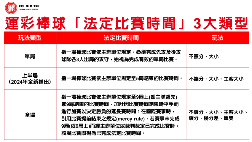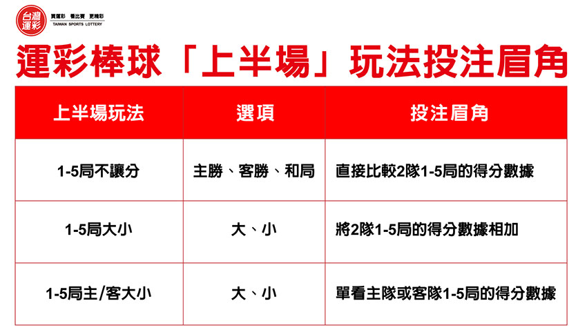 運彩棒球一直以來深受大家喜愛,除了「全場」和「單局」的玩法可以投注外,第三屆運彩全新上市之際也新增了「上半場」的相關玩法,那麼棒球「上半場」玩法在投注時有沒有什麼可以參考的眉角呢!今天就來跟大家分享一下。 |