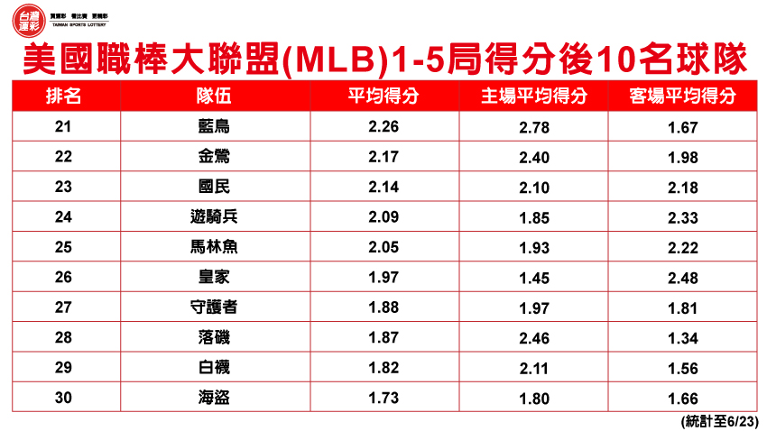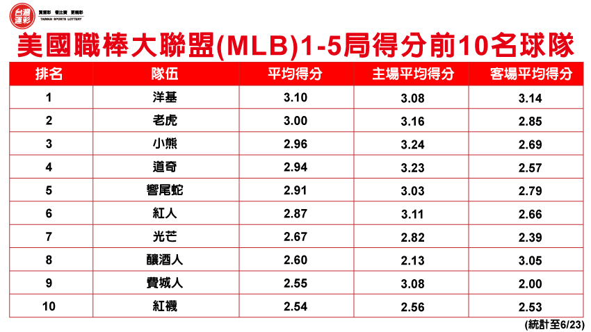 | 運彩棒球「上半場」類型的玩法是第三屆運彩上市之際全新推出,與第二屆運彩原有的「全場」、「單局」一樣有趣又好玩,我們從美國職棒大聯盟(MLB)1-5局各隊的得分統計數據來看(統計至6/23),名列前矛的球隊有洋基(3.10分)、老虎(3.00分) 、小熊(2.96分)、道奇(2.94分)、響尾蛇(2.91分)…以及紅襪(2.54分)等,得分排名居末段的球隊為海盜(1.73分) 、白襪(1.82分)、落磯(1.87分)、守護者(1.88分)、皇家(1.97分)…以及藍鳥(2.26分)等。 |