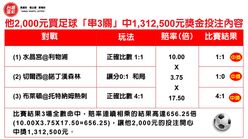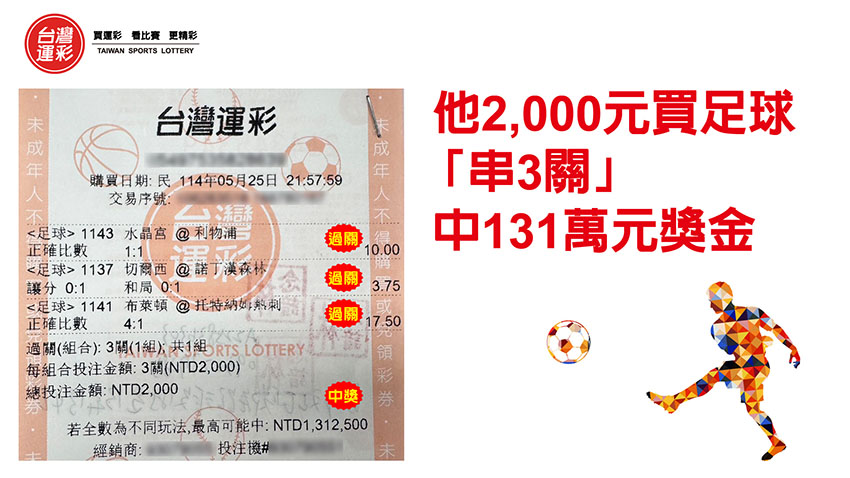 他買英超足球「串3關」中131萬元獎金(20250812中時電子報)