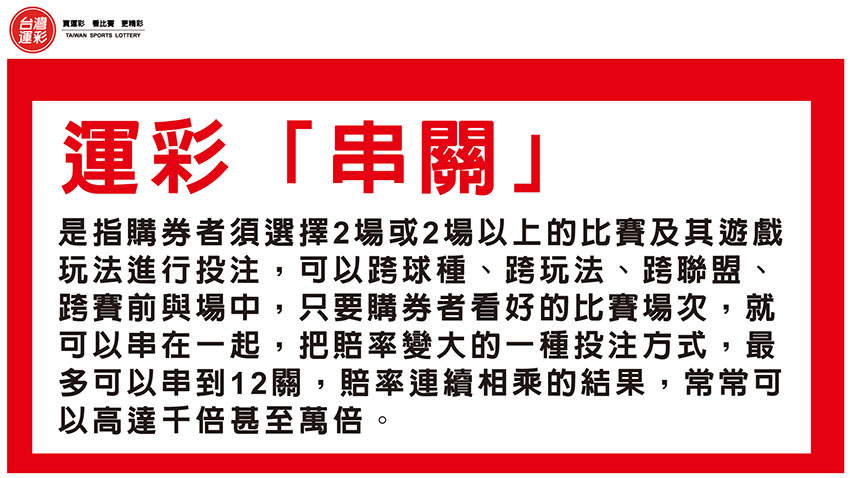 | 運彩「串關」是指購券者須選擇2場或2場以上的比賽及其遊戲玩法進行投注,可以跨球種、跨玩法、跨聯盟、跨賽前與場中,只要購券者看好的比賽場次,就可以串在一起,把賠率變大的一種投注方式,最多可以串到12關,賠率連續相乘的結果,常常可以高達千倍甚至萬倍。 |