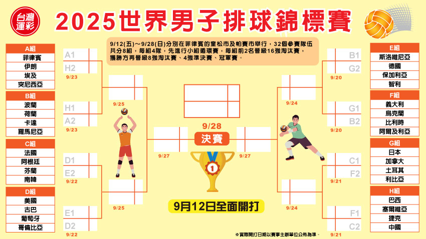2025世界男子排球錦標賽開戰 運彩開盤提供投注(20250909中時電子報)