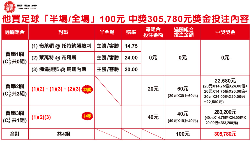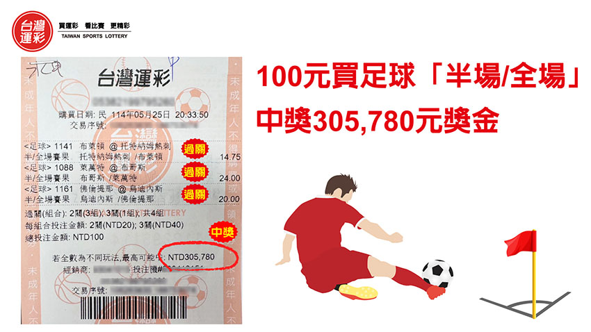 他買足球「半場/全場」100元 中獎305,780元獎金(20250923中時電子報)