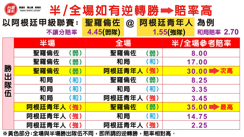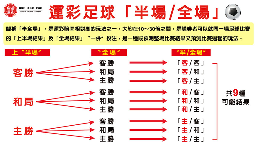 | 足球「半場/全場」的玩法是消費者可以就同一場足球比賽的「上半場結果」及「全場結果」〝一併〞投注,是一種既預測整場比賽結果又預測比賽過程的玩法,「上半場結果」有3種情形,分別是客勝、和局及主勝,「全場結果」同樣也有客勝、和局及主勝等3種情形,一併預測的可能結果就有9種情形(3X3=9),分別是「客勝/客勝」、「客勝/和局」、「客勝/主勝」、「和局/客勝」、「和局/和局」、「和局/主勝」、「主勝/客勝」、「主勝/和局」及「主勝/主勝」。如果大家進一步就這9種情形的賠率進行探討,可以發現一些眉角,譬如:「上半場強隊勝但整場卻是弱隊逆轉勝」的賠率往往是最高(30倍左右),因為上半場強隊勝的情況下,弱隊要在比賽時間剩餘一半的下半場把分數追平甚至勝出的難度是高的,所以賠率往往可以高達30倍,反之上半場及全場都是強隊勝的可能性比較高,所以其賠率也就相對較低。 |