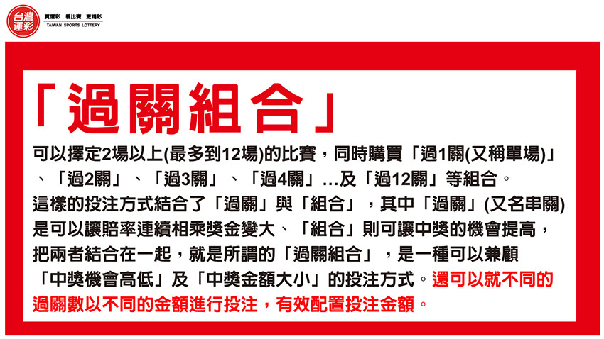 | 「過關組合」是消費者可以擇定2場以上(最多到12場)的比賽,同時購買「過1關(又稱單場)」、「過2關」、「過3關」、「過4關」…、「過12關」等組合。這樣的投注方式結合了「過關」與「組合」,其中「過關」(又名串關)是可以讓賠率連續相乘獎金變大、「組合」則可讓中獎的機會提高,把兩者結合在一起,就是所謂的「過關組合」,是一種可以兼顧「中獎機會高低」及「中獎金額大小」的投注方式。還可以就不同的過關數以不同的金額進行投注,有效配置投注金額。 |