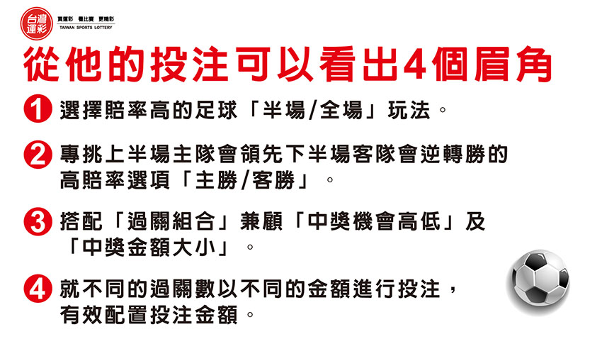 | 從他的投注內容可以看出4個眉角:1.選擇賠率高的足球「半場/全場」玩法;2.專挑上半場主隊會領先下半場客隊會逆轉勝的高賠率選項「主勝/客勝」;3.搭配「過關組合」兼顧「中獎機會高低」及「中獎金額大小」;4.就不同的過關數以不同的金額進行投注,有效配置投注金額。提供大家投注參考,希望下一個過關中大獎的人會是你。 |