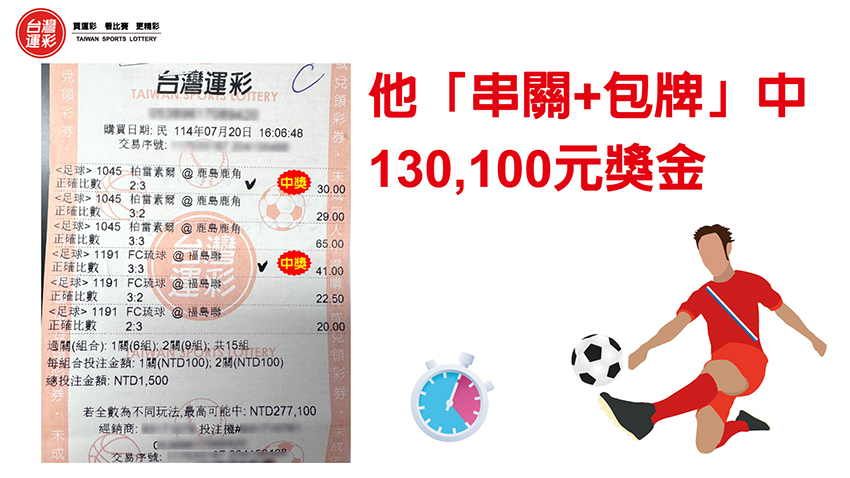他「串關+包牌」中130,100元獎金(20251111中時電子報)