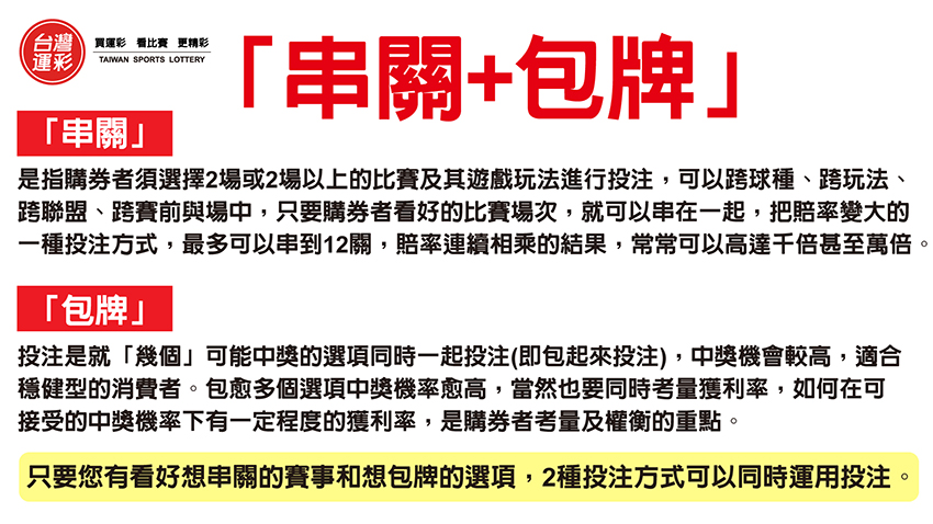 | 運彩「串關+包牌」,其中「串關」是指購券者須選擇2場或2場以上的比賽及其遊戲玩法進行投注,可以跨球種、跨玩法、跨聯盟、跨賽前與場中,只要購券者看好的比賽場次,就可以串在一起,把賠率變大的一種投注方式,最多可以串到12關,賠率連續相乘的結果,常常可以高達千倍甚至萬倍。「包牌」投注是就「幾個」可能中獎的選項同時一起投注(即包起來投注),中獎機會較高,適合穩健型的消費者。包愈多個選項中獎機率愈高,當然也要同時考量獲利率,如何在可接受的中獎機率下有一定程度的獲利率,是購券者考量及權衡的重點。只要您有看好想串關的賽事和想包牌的選項,2種投注方式可以同時運用投注。 |