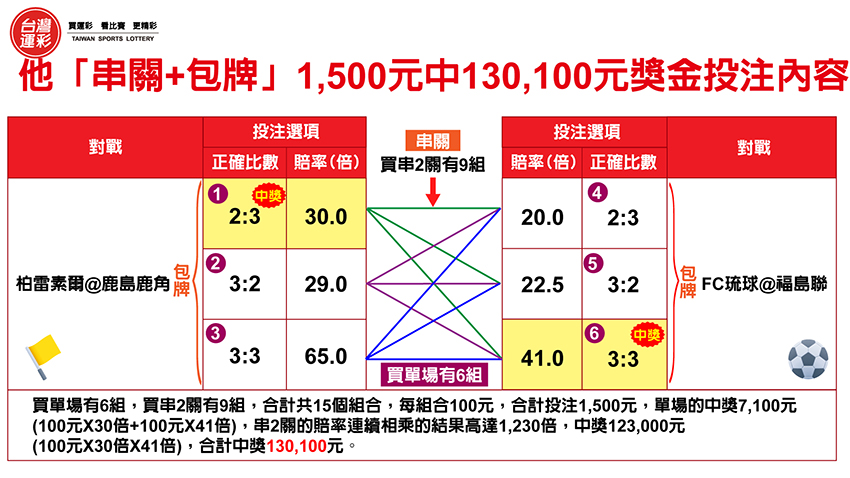 | 7/20台中北屯的投注站有位購券者買運彩時挑了2場足球賽事,並且以「串關+包牌」方式來提高中獎的金額與中獎的機率,投注內容為「包牌」1.賠率30.0倍的「柏雷素爾@鹿島鹿角 正確比數2:3」、2.賠率29.0倍的「柏雷素爾@鹿島鹿角 正確比數3:2」、3.賠率65.0倍的「柏雷素爾@鹿島鹿角 正確比數3:3」;再「包牌」串4.賠率41.0倍的「FC琉球@福島聯 正確比數 3:3」、5.賠率22.5倍的「FC琉球@福島聯 正確比數 3:2」、6.賠率20.0倍的「FC琉球@福島聯 正確比數 2:3」,買單場有6組,買串2關有9組,合計共15個組合,每組合100元,合計投注1,500元,比賽結果為「柏雷素爾 @ 鹿島鹿角2:3」、「FC琉球 @ 福島聯 3:3」,單場的中獎7,100元(100元X30倍+100元X41倍),串2關的中獎123,000元(100元X30倍X41倍),合計中獎130,100元。 |