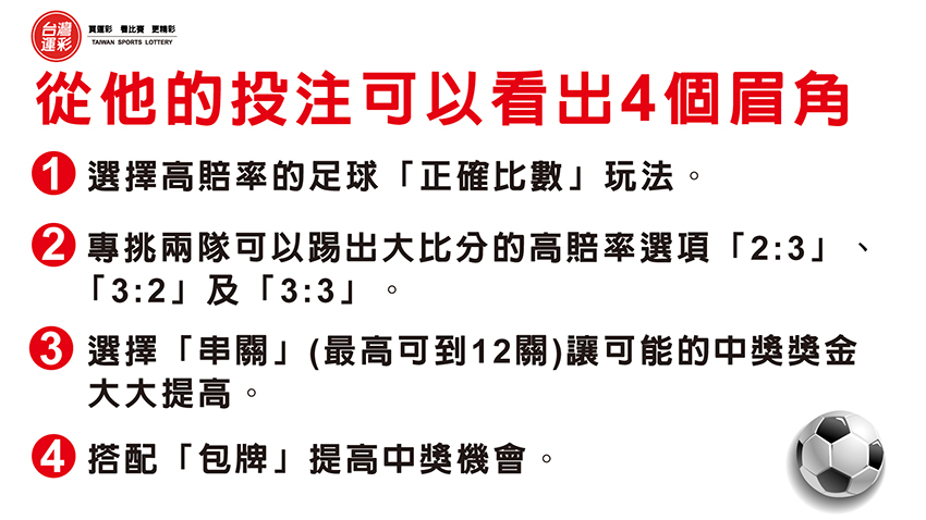 | 從他的投注內容可以看出4個眉角:1.選擇賠率高的足球「正確比數」玩法;2.專挑兩隊可以踢出大比分的高賠率選項「2:3」、「3:2」及「3:3」;3.選擇「串關」(最高可到12關)讓可能的中獎獎金大大提高;4.搭配「包牌」提高中獎機會。提供大家投注參考,希望下一個中大獎的人會是你。 |