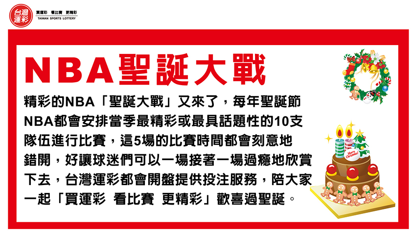 每到聖誕節世界各地都會舉辦慶祝活動,運彩也應景推出NBA「聖誕大戰」7大玩法投注服務,希望大家會喜歡。 |