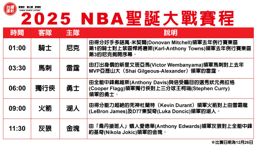 每年聖誕節NBA都會安排當季最精彩或最具話題性的10支隊伍進行比賽,即所謂的NBA「聖誕大戰」,這5場的比賽時間都會刻意地錯開,好讓球迷們可以一場接著一場過癮地欣賞下去,今年NBA「聖誕大戰」從台北時間12/26(五)01:00開始,由去年例行賽東區第1的騎士(得分好手多諾萬·米契爾(Donovan Mitchell)領軍)對上第3的尼克(禁區悍將唐斯(Karl-Anthony Towns)領軍)揭開序幕;接著03:30由馬刺(打出身價的新星文班亞馬(Victor Wembanyama)領軍)對上去年總冠軍的雷霆(去年MVP亞歷山大(Shai Gilgeous-Alexander)領軍);第3場06:00由獨行俠 (全能大前鋒戴維斯(Anthony Davis)與倍受矚目的選秀狀元弗拉格(Cooper Flagg)領軍) 對上勇士(三分球王柯瑞(Stephen Curry)領軍);第4場09:00火箭(得分能力超絕的死神杜蘭特(Kevin Durant)領軍)對上湖人(雷霸龍(LeBron James)及D77東契奇(Luka Doncic)領軍);壓軸的第5場灰狼11:30(「喬丹接班人」蟻人愛德華(Anthony Edwards)領軍)對上金塊(全能中鋒約基奇(Nikola Jokic)領軍)。 |