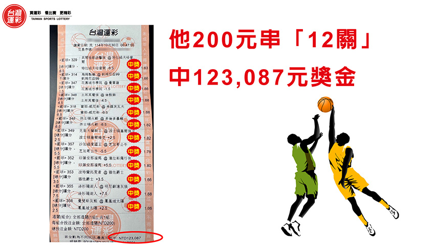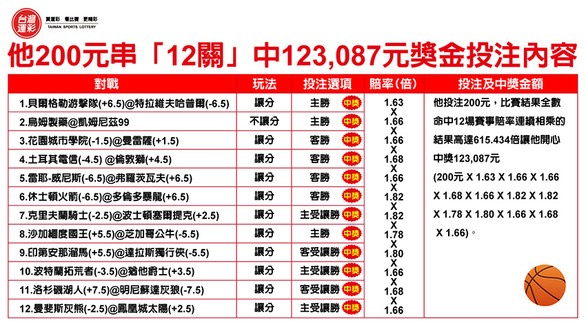 | 去年10/30台中南屯投注站有位購券者他買運彩時挑了12場籃球賽事,並且買串12關讓賠率連續相乘來提高可能中獎的金額,分別是1.賠率1.63倍的「貝爾格勒游擊隊@特拉維夫哈普爾 讓分主勝」、2.賠率1.66倍的「烏姆製藥@凱姆尼茲99 不讓分主勝」、3.賠率1.66倍的「花園城市學院@曼雷薩 讓分客勝」、4.賠率1.68倍的「土耳其電信@倫敦獅 讓分客勝」、5.賠率1.66倍的「雷耶-威尼斯@弗羅茨瓦夫 讓分客勝」、6.賠率1.82倍的「休士頓火箭@多倫多暴龍 讓分客勝」、7.賠率1.82倍的「克里夫蘭騎士@波士頓塞爾提克 讓分主受讓勝」、8.賠率1.78倍的「沙加緬度國王@芝加哥公牛 讓分主勝」、9.賠率1.80倍的「印第安那溜馬@達拉斯獨行俠 讓分客受讓勝」、10.賠率1.66倍的「波特蘭拓荒者@猶他爵士 讓分主受讓勝」、11.賠率1.68倍的「洛杉磯湖人@明尼蘇達灰狼 讓分客受讓勝」以及12.賠率1.66倍的「曼斐斯灰熊@鳳凰城太陽 讓分主受讓勝」,比賽結果全數命中,12場賽事賠率連續相乘的結果高達615.434倍,讓他投注200元開心中獎123,087元。 |