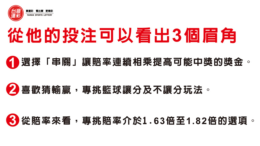 | 從他的投注內容可以看出3個眉角:1. 選擇「串關」讓賠率連續相乘提高可能中獎的獎金。2.喜歡猜輸贏,專挑籃球讓分及不讓分玩法。3. 從賠率來看,專挑賠率介於1.63倍至1.82倍的選項。提供大家投注參考,希望下一個過關中大獎的人就會是你。 |