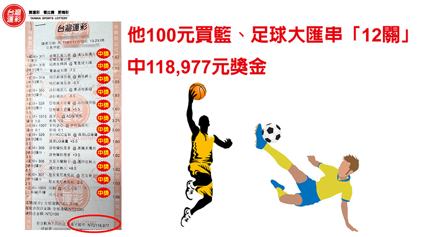 去年11/10台中大雅投注站有位購券者他買運彩時挑了9場籃球及3場足球賽事,並且買串12關讓賠率連續相乘來提高可能中獎的金額,分別是1.賠率1.62倍的「密爾瓦基公鹿@達拉斯獨行俠 不讓分客勝」、2.賠率1.65倍的「紐奧良鵜鶘@鳳凰城太陽 讓分主勝」、3.賠率1.65倍的「明尼蘇達灰狼@猶他爵士 讓分客勝」、4.賠率1.63倍的「洛杉磯湖人@夏洛特黃蜂 讓分客勝」、5.賠率1.60倍的「亞特蘭大老鷹@洛杉磯快艇 讓分客受讓勝」、6.賠率3.25倍的「昌卡人@AD塔爾馬 讓分和局」、7.賠率3.00倍的「卡利瑟亞@伊利烏波利 讓分和局」、8.賠率1.60倍的「全州KCC宙斯@昌原LG獵鷹 讓分主受讓勝」、9.賠率1.62倍的「波特蘭拓荒者@奧蘭多魔術 讓分客受讓勝」、10.賠率1.62倍的「克里夫蘭騎士@邁阿密熱火 讓分主受讓勝」、11.賠率1.63倍的「聖安東尼奧馬刺@芝加哥公牛 讓分客勝」以及12.賠率1.55倍的「河靜@河內公安 上半場不讓分主勝」,比賽結果全數命中,12場賽事賠率連續相乘的結果高達1,189.77倍,讓他投注100元開心中獎118,977元。 |