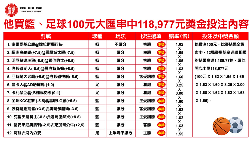 他買籃、足球100元大匯串中118,977元獎金(20260224中時電子報)