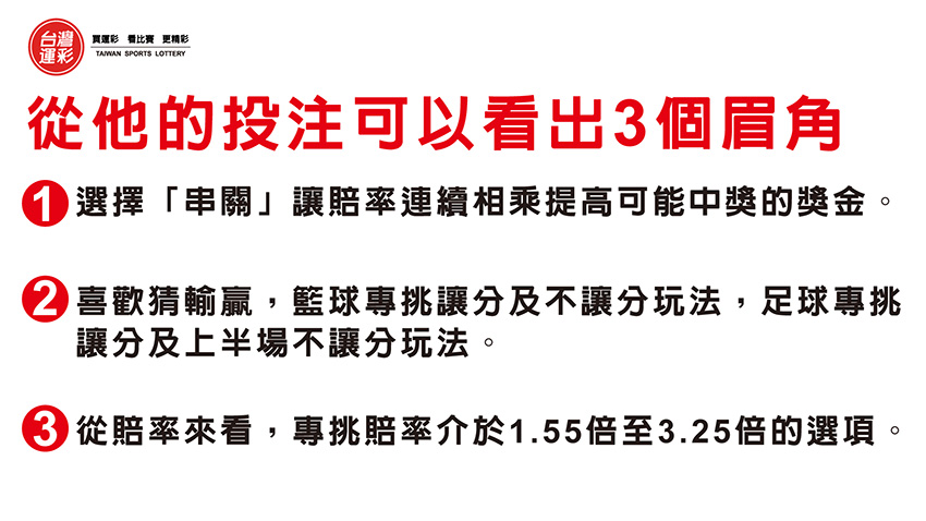 | 從他的投注內容可以看出3個眉角:1. 選擇「串關」讓賠率連續相乘提高可能中獎的獎金。2.喜歡猜輸贏,籃球專挑讓分及不讓分玩法,足球專挑讓分及上半場不讓分玩法。3. 從賠率來看,專挑賠率介於1.55倍至3.25倍的選項。提供大家投注參考,希望下一個過關中大獎的人就會是你。 |