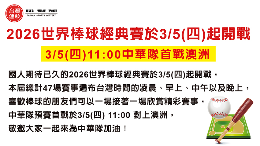 國人期待已久的2026世界棒球經典賽於3/5(四)起開戰,本屆總計47場賽事遍布台灣時間的凌晨、早上、中午以及晚上,喜歡棒球的朋友們可以一場接著一場欣賞精彩賽事,中華隊預賽首戰於3/5(四) 11:00 對上澳洲,敬邀大家一起來為中華隊加油!那麼經典賽的賽制在運彩投注時有沒有什麼眉角,今天利用這個機會來跟大家談一談。 |
