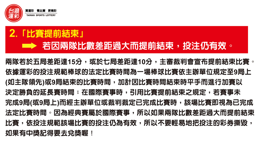 | 其次是「比賽提前結束」,兩隊若於五局差距達15分,或於七局差距達10分,主審裁判會宣布提前結束比賽。依據運彩的投注規範棒球的法定比賽時間為一場棒球比賽依主辦單位規定至9局上(如主隊領先)或9局結束的比賽時間,加計因比賽時間結束時平手而進行加賽以決定勝負的延長賽時間;在國際賽事時,引用比賽提前結束之規定,若賽事未完成9 局(或9 局上)而經主辦單位或裁判裁定已完成比賽時,該場比賽即視為已完成法定比賽時間。因為經典賽屬於國際賽事,所以如果兩隊比數差距過大而提前結束比賽,依投注規範該場比賽的投注仍為有效,所以不要輕易地把投注的彩券撕毀,如果有中獎記得要去兌獎喔! |