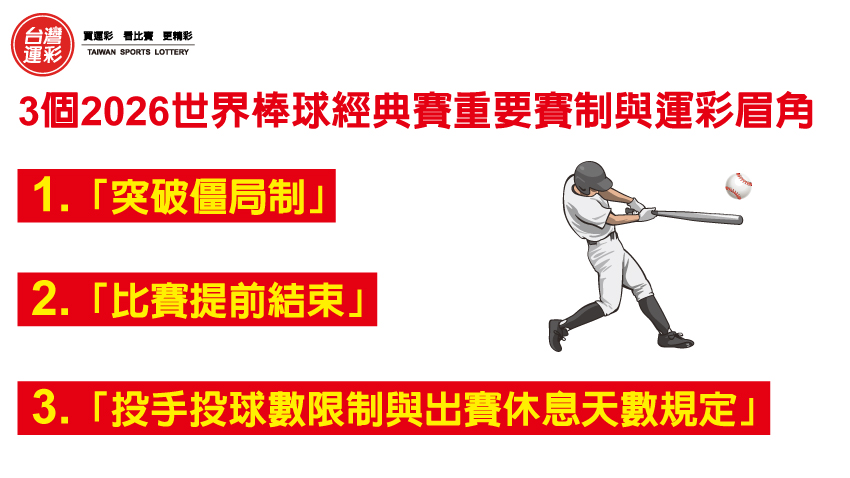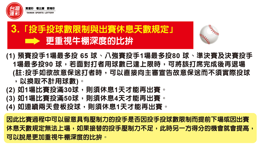 最後就是「投手投球數限制與出賽休息天數規定」,預賽投手1場最多投 65 球、八強賽投手1場最多投80 球、準決賽及決賽投手1場最多投90 球,若面對打者用球數已達上限時,可將該打席完成後再退場(註:投手如欲故意保送打者時,可以直接向主審宣告故意保送而不須實際投球,以換取不計用球數)。投手如1場比賽投滿 30 球,則須休息 1 天才能再出賽;如1場比賽投滿 50 球,則須休息 4 天才能再出賽;如連續兩天登板投球(無論投球數多寡),則須休息 1 天才能再出賽。因此比賽過程中可以留意具有壓制力的投手是否因投手投球數限制而提前下場或因出賽休息天數規定無法上場,如果接替的投手壓制力不足,此時另一方得分的機會就會提高,可以說是更加重視牛棚深度的比拚。 以上3個2026世界棒球經典賽重要賽制與運彩眉角,提供大家「買運彩 看比賽 更精彩」、「買運彩 助體育 增光彩」。 |