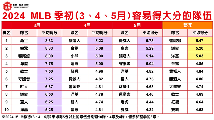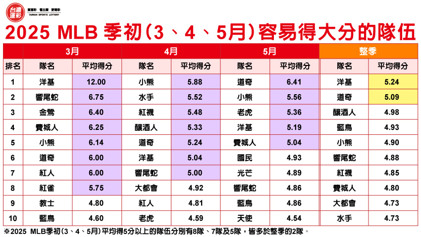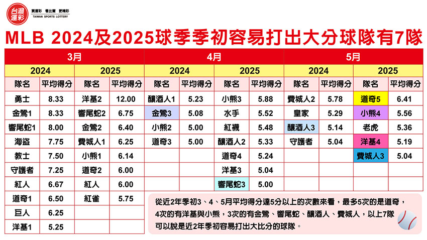 | 再從近2年季初3、4、5月平均得分達5分以上的次數來看,最多5次的是道奇,4次的有洋基與小熊,3次的有金鶯、響尾蛇、釀酒人、費城人,以上7隊可以說是近2年季初容易打出大比分的球隊,提供喜歡投注運彩大小分玩法的朋友們參考。 |