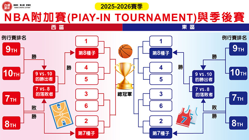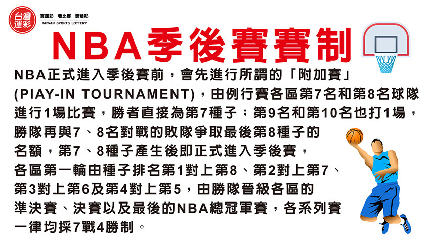 本季NBA例行賽4/13結束,東、西區戰績排名7至10名的隊伍將於4/15~18進行附加賽爭取各區最後2個可以進入季後賽的名額,季後賽4/19正式展開,第一輪系列賽依種子排名第1對上第8、第2對上第7、第3對上第6及第4對上第5,賽事精彩可期,今天除了講一下NBA季後賽賽制外,也來跟大家聊聊附加賽及季後賽運彩「勝分差」玩法的投注眉角。 |