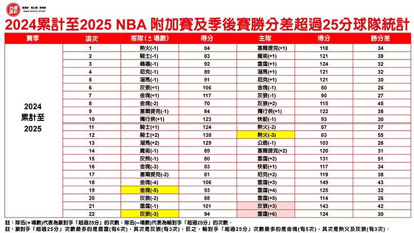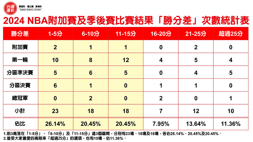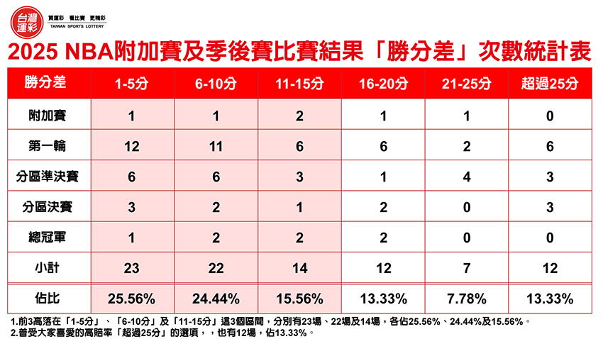 | 再來就是有關「勝分差」玩法在附加賽及季後賽期間值得參考的數據,統計近2年NBA附加賽及季後賽各場次的比賽結果,在「勝分差」部分皆有一致的情形,那就是落在「1-5分」、「6-10分」及「11-15分」這3個區間的次數及比例都是相對高,2024分別有23場、18場及18場,各佔26.14%、20.45%及20.45%;2025分別有23場、22場及14場,各佔25.56%、24.44%及15.56%,這主要是因為附加賽及季後賽的競爭相對激烈,各隊實力也相對接近,比分比較容易呈現膠著,最終勝負的差距相對有限,多數集中在15分以內。此外,普受大家喜愛的高賠率「超過25分」的選項,近2年來也分別有10場及12場,各佔11.36%及13.33%,其中贏對手「超過25分」次數最多的是雷霆,有6次之多,其次是灰狼,有3次;反之,輸對手「超過25分」次數最多的則是金塊,有5次之多,其次是熱火及灰狼,各有3次,提供大家「勝分差」投注參考。 |